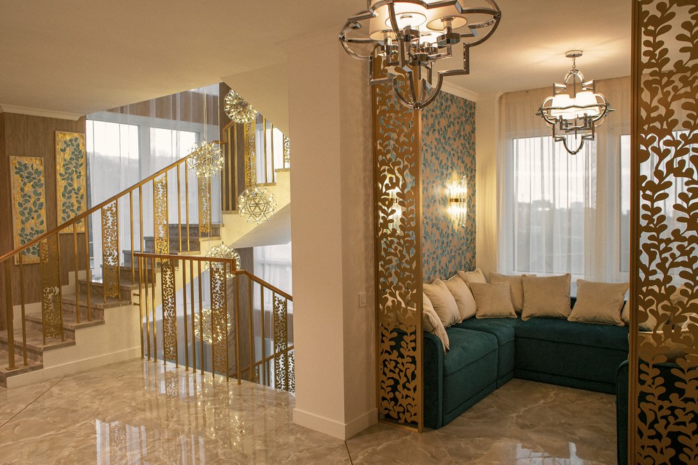 - Отделка стен и потолков: Латунные панели и молдинги с инкрустацией позволяют создать роскошный и неповторимый дизайн.