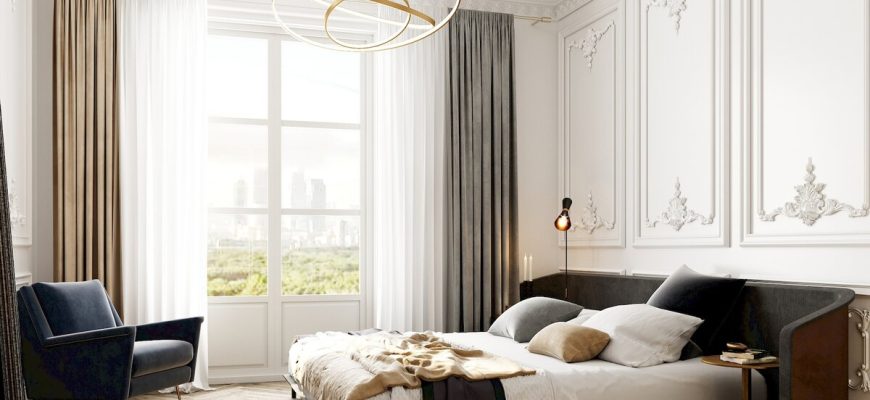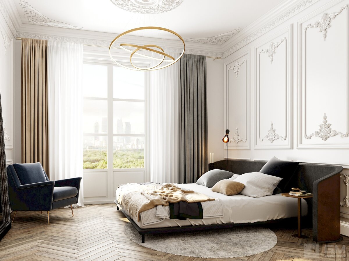 В спальне лепнина и розетки должны создавать спокойную и уютную атмосферу. Здесь можно использовать небольшие карнизы‚ молдинги и розетки с нежным узором.