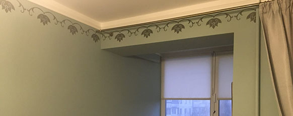 - Приклеивание бордюра: Приложите бордюр к стене по разметке и плотно прижмите его. Удалите излишки клея влажной тряпкой.
