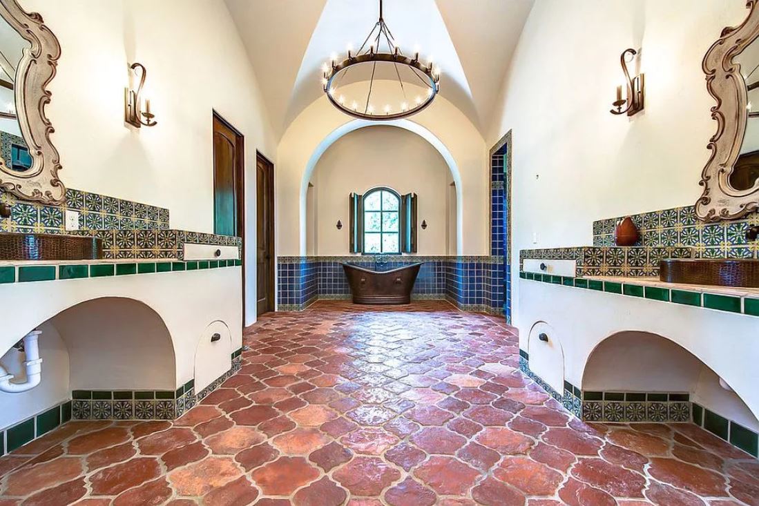 | Испанский стиль в ванной | Дизайн ванной в золотом цвете | Ванная комната терракота | Роскошная ванная комната | Ванная комната в испанском стиле фото |