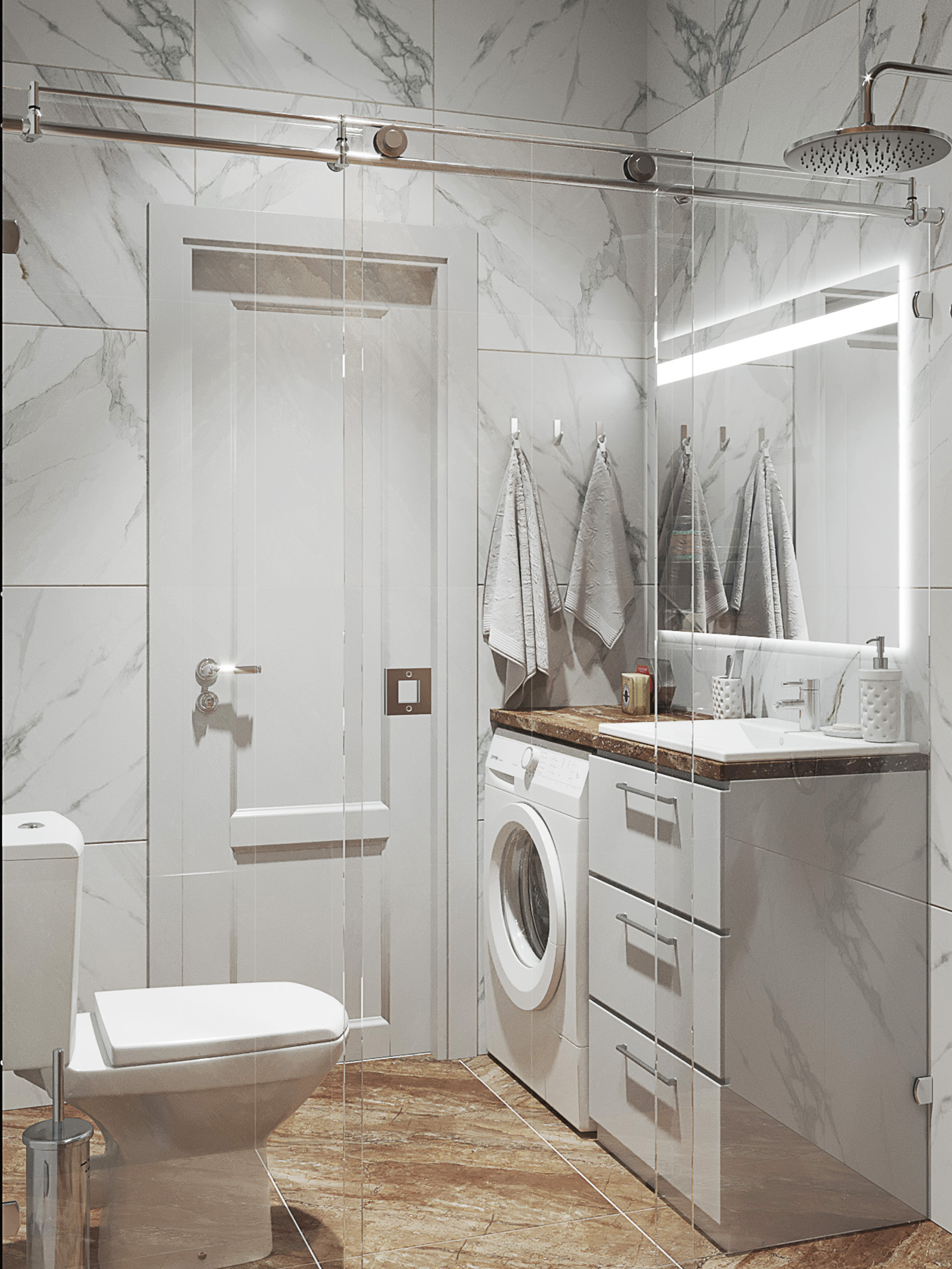 Мрамор – идеальный материал для столешниц, полов и стен. Его уникальный рисунок и текстура добавят ванной комнате неповторимый шарм. Камень можно использовать для отделки душевой зоны или создания акцентной стены.