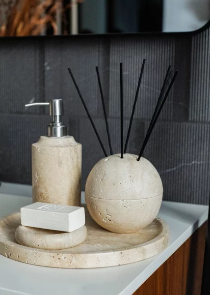 • Керамика: Идеально подходит для мыльниц, дозаторов для мыла и стаканов для зубных щеток. Выбирайте керамику с рельефными узорами или ручной росписью.