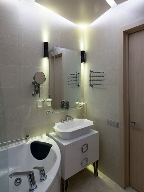 - Точечные светильники: Идеальны для подсветки отдельных зон. Их можно установить над зеркалом или по бокам.
